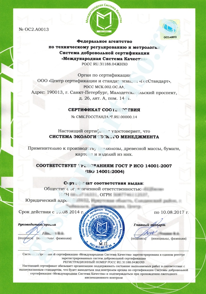 Стоимость сертификата ISO 14001:2004 (ГОСТ Р ИСО 14001-2007)