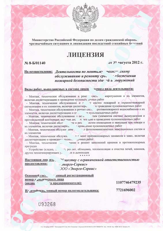 1. Монтаж, техническое обслуживание и ремонт систем пожаротушения и их элементов, включая диспетчеризацию и проведение пусконаладочных работ2. Монтаж, техническое обслуживание и ремонт систем пожарной и охранно-пожарной сигнализации и их элементов, включая диспетчеризацию и проведение пусконаладочных работ. 3. Монтаж, техническое обслуживание и ремонт систем противопожарного водоснабжения и их элементов, включая диспетчеризацию и проведение пусконаладочных работ. 4. Монтаж, техническое обслуживание и ремонт систем (элементов систем) дымоудаления и противодымной вентиляции, включая диспетчеризацию и проведение пусконаладочных работ. 5. Монтаж, техническое обслуживание и ремонт систем оповещения и эвакуации при пожаре и их элементов, включая диспетчеризацию и проведение пусконаладочных работ 6. Монтаж, техническое обслуживание и ремонт фотолюминесцентных эвакуационных систем и их элементов 7. Монтаж, техническое обслуживание и ремонт противопожарных занавесов и завес, включая диспетчеризацию и проведение пусконаладочных работ 8. Монтаж, техническое обслуживание и ремонт заполнений проемов в противопожарных преградах 9. Устройство (кладка, монтаж), ремонт, облицовка, теплоизоляция и очистка печей, каминов, других теплогенерирующих установок и дымоходов 10. Выполнение работ по огнезащите материалов, изделий и конструкций 11. Монтаж, техническое обслуживание и ремонт первичных средств пожаротушения. Перечень документов для получения лицензии МЧС• Свидетельство ОГРН – нотариальная копия;• Свидетельства ГРН (если были изменения) - нотариальная копия; • Выписка из ЕГРЮЛ (не позднее 1 мес.) - нотариальная копия или оригинал; • Свидетельство ИНН - нотариальная копия; • Устав - нотариальная копия; • Решение (Протокол собрания) и Приказ о назначении директора - нотариальная копия; • Документы на работников на двух сотрудников дипломы (высшее или средне обр. техническое), Трудовые книжки, Трудовые договоры, Удостоверения о повышении квалификации – оригиналы или нотариальные копии, Паспорта (страница с фото и пропиской); • Квитанция (платежка) об оплате госпошлины – оригинал с «синей» печатью банка; • Оригинал договора аренды, акт передачи оригинал, копия свидетельства, на собственность помещения заверенная собственником помещения. Стоимость лицензии МЧС под ключ от 80 000 рублейПомощь в получении пожарной лицензии МЧС под ключ |